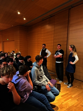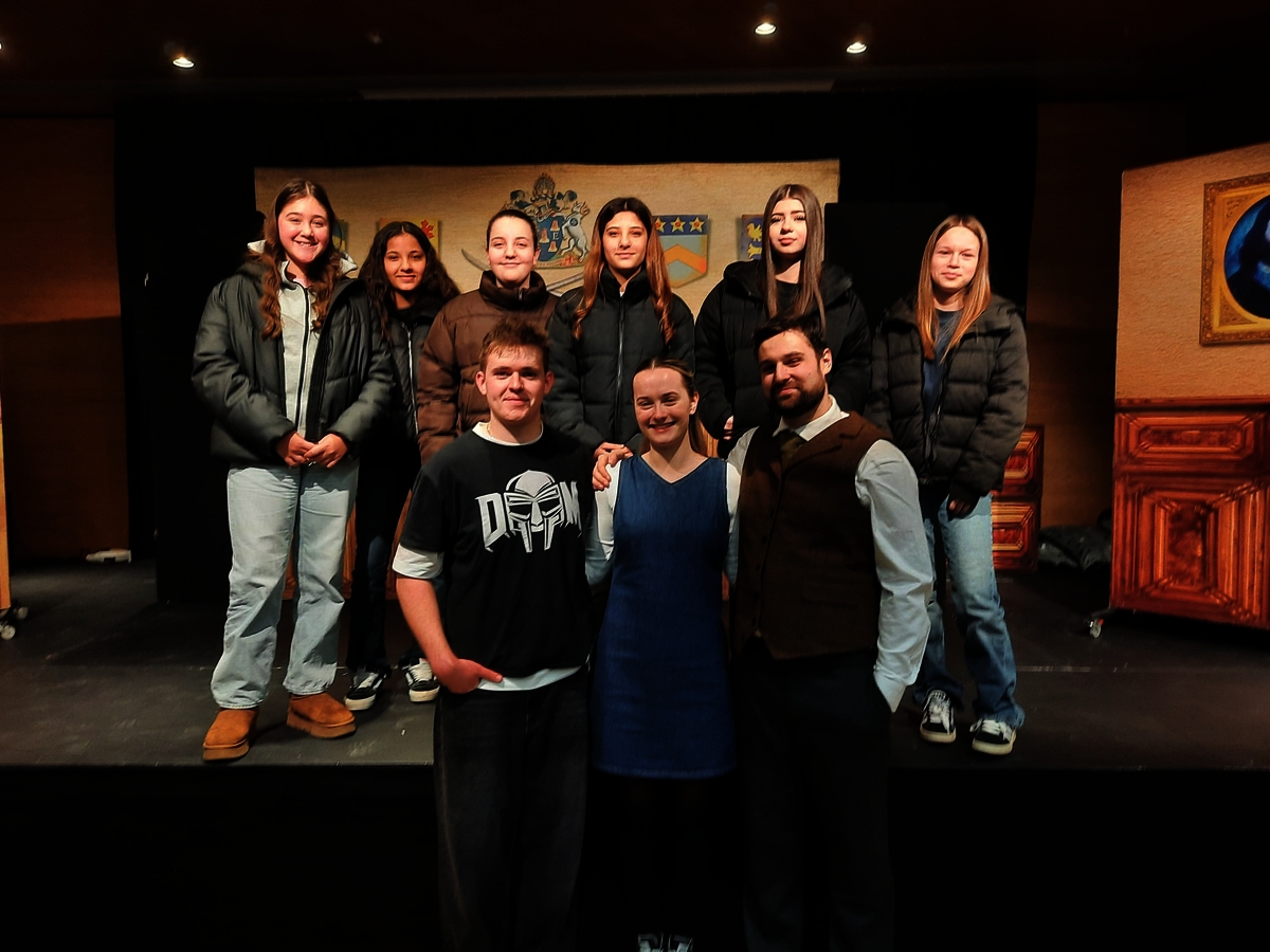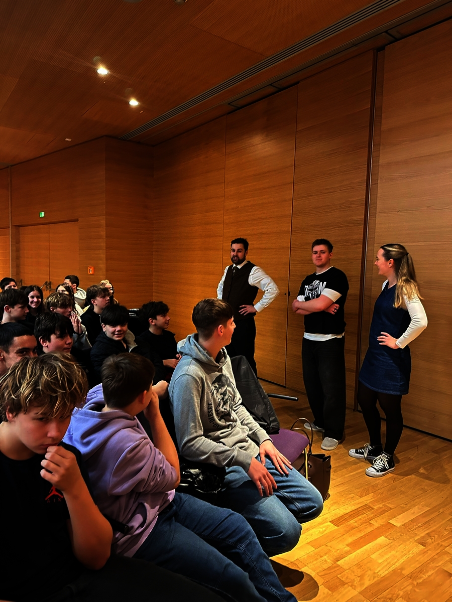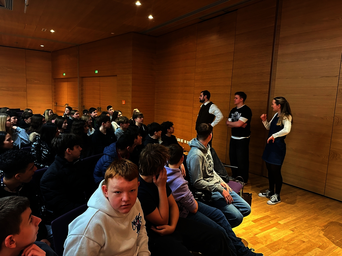 Schon vor Beginn der Vorstellung herrschte große Begeisterung: Die Schülerinnen und Schüler nutzten die Gelegenheit, mit den Darstellerinnen und Darstellern zu plaudern, die eigens aus London angereist waren. Die mitreißende Aufführung sorgte für viele begeisterte Gesichter und machte den Theaterbesuch zu einem besonderen Erlebnis – ein voller Erfolg für alle Beteiligten!